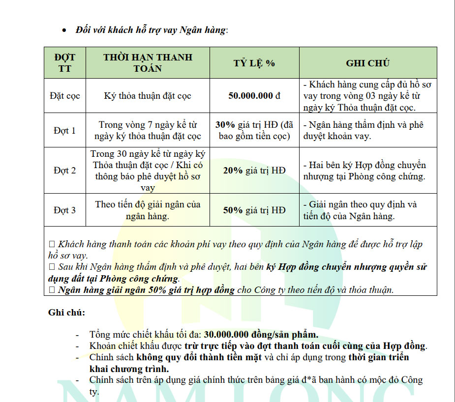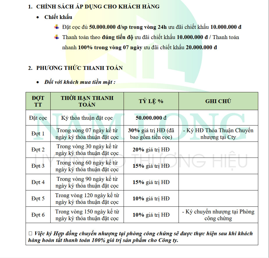 - Chiết khấu : Voucher trị giá 10.000.000 vnđ khách hàng thanh toán công chứng đúng hạn theo quy định Phương thức thanh toán như sau: